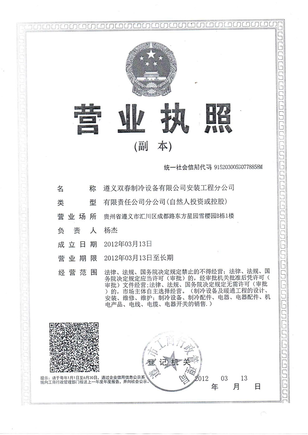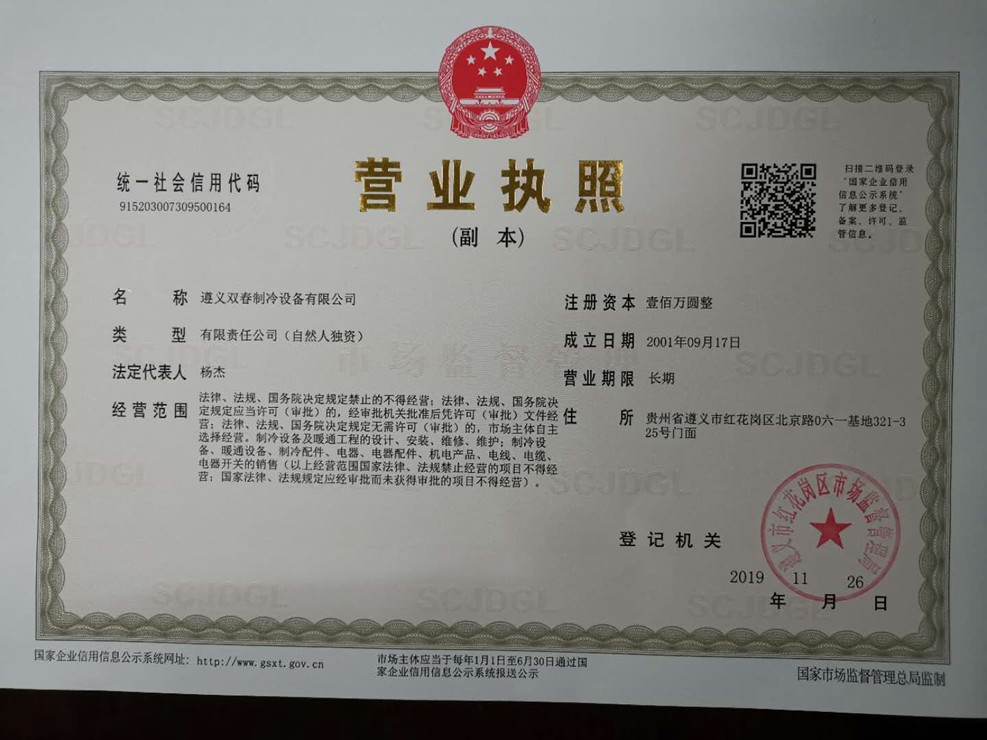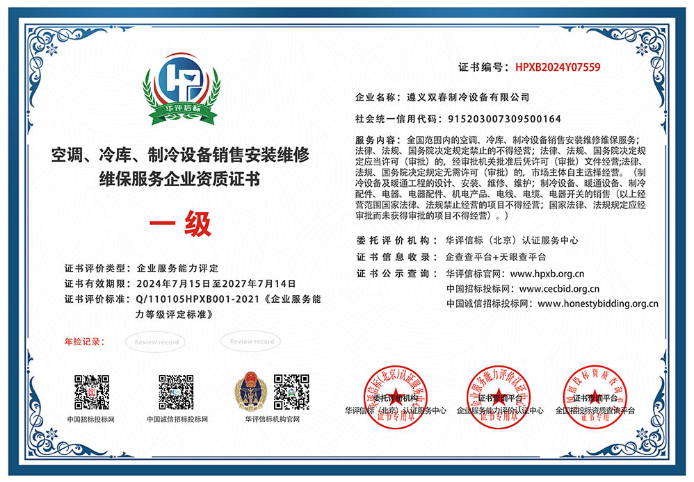 空調、冷庫、制冷設備銷售安裝維修維保服務企業資質證書