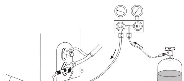 用高、低壓壓力表或復合式壓力表測試充氟中的制冷系統,若高、低壓力表表壓值符合上述范圍即表明制冷劑的充注量合適;若高、低壓壓力均低則表明充入量不夠;若高、低壓壓力均高,則表明充入量過多。壓力測定法較為簡便,在維修時經常作用,但是缺點是比較粗,準確度不高。