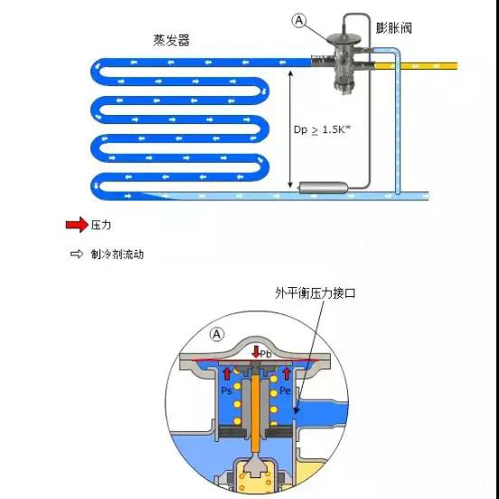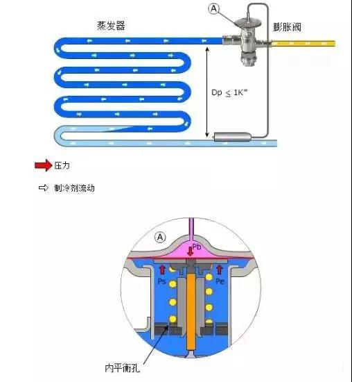 內平衡式的平衡壓力在蒸發器入口處取,用于制冷劑在蒸發器里的壓力損失較小的系統。