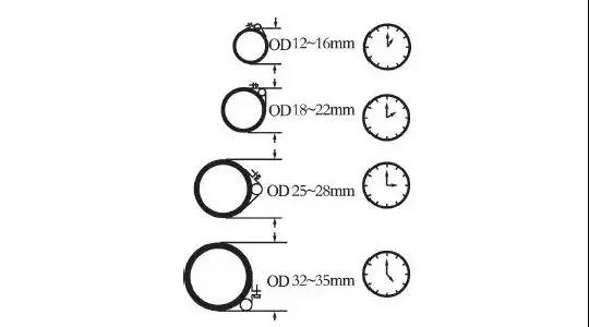 對于 12 ~ 16 mm的管徑,感溫包宜安裝在吸氣管的“1 點鐘”位置。