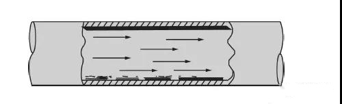 之所以這樣做,是因為吸氣管中主要是已蒸發的制冷劑,但是也有少許制冷劑液體和油。下圖顯出制冷劑蒸氣和一些液珠流過較大管徑的吸氣管。由于管徑較大,制冷劑蒸氣的流速常常很低,制冷劑液珠和油沉積在管線底部。