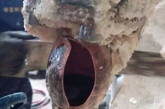 某庫遭到客戶投訴,電磁閥進(jìn)口位置銅管開裂(如圖),造成大量制冷劑泄漏。