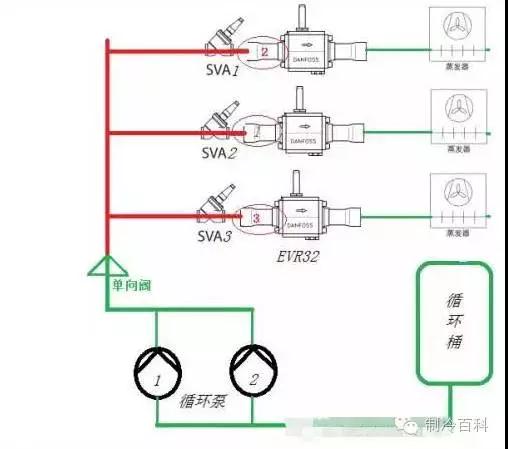 客戶系統(tǒng)圖如下所示,三只電磁閥分別給三間冷庫供液。庫溫降低到設(shè)定溫度,電磁閥切斷供液,庫溫回升,電磁閥開啟供液。中間1號(hào)電磁閥為故障閥。