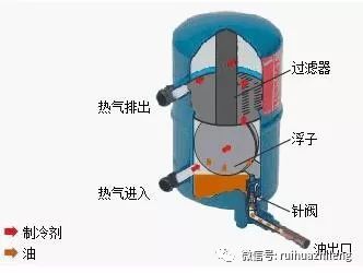 4、油位升高時,浮子打開一個針閥,讓油回到壓縮機集油槽。