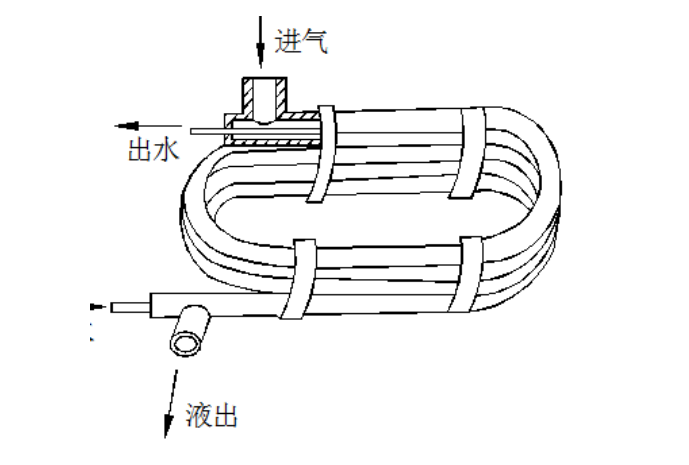 1—出液管;2—壓力表接頭;3—進氣管;4—配水箱;5—安全閥接頭;6—均壓管;7—放空管;8—放油管3. 套管式冷凝器:它是由不同直徑的管子套在一起,并彎制成螺旋形或蛇形的一種水冷式冷凝器。如圖所示,制冷劑蒸氣在套管間冷凝,冷凝液從下面引出,冷卻水在直徑較小的管道內自下而上流動,與制冷劑成逆流式,因此傳熱效果較好。套管式冷凝器